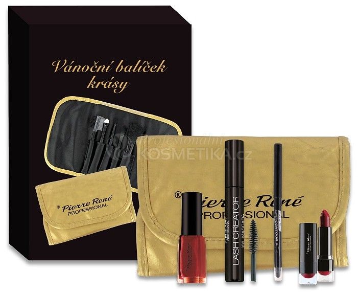 Pierre René Vánoční balíček krásy č.41 - Řasenka XXL + Rtěnka + Tužka na oči + Lak na nehty + Zlaté pouzdro se štětci Dárková sada