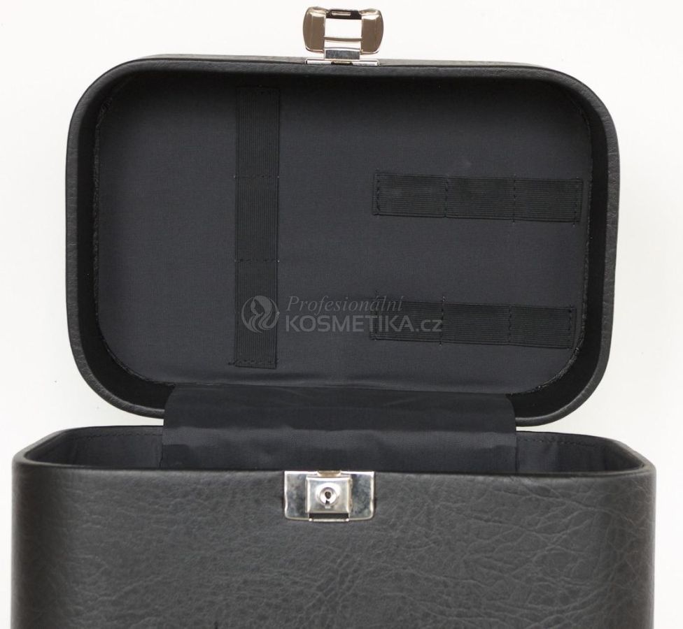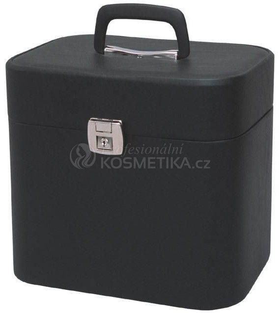 Kadeřnický kufřík s plastovým držadlem se uzavírá poniklovaným zámkem na klíček, ve víkové části jsou poutka z gumy a ve spodní části další poutka a kapsa. Materiál: koženka, barva: černá, rozměry: 30 x 20 x 26