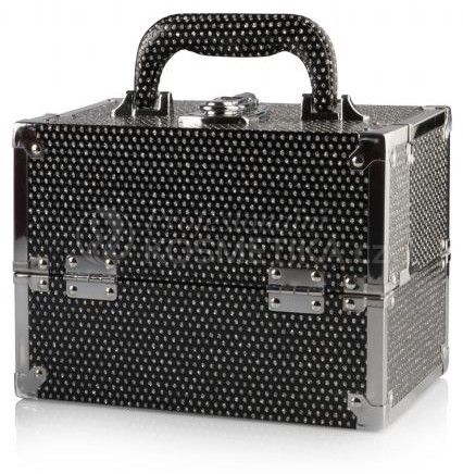 Černý třpytivý cestovní kosmetický kufřík se dvěmi rozkládacími policemi a hlavním prostorem. Rozměry: 22,5 X 16,7 X 16,7
