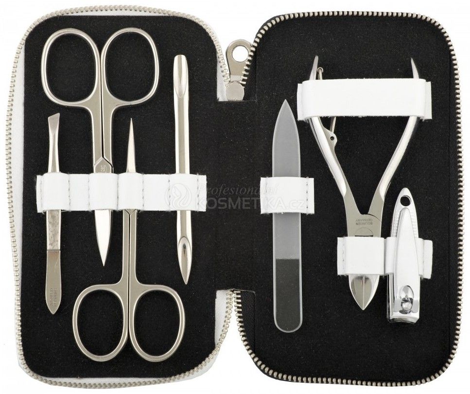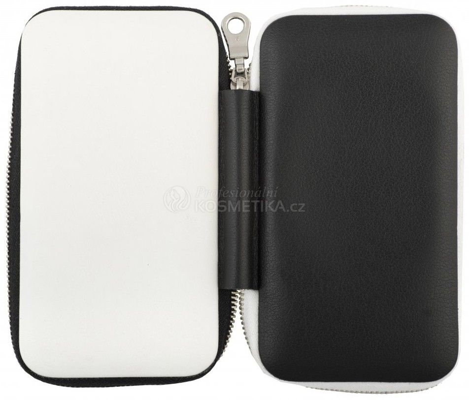 Elegantní manikúrní set 7-dílný, vyroben z černé a bílé kůže s kovovým zipem, uzavírá se na zip, hodí se do kabelky každé ženy. Je naplněn manikúrním náčiním značky Solingen a DUP se skleněným pilníkem. Rozměry: 14,5 x 8,5 x 2 cm.