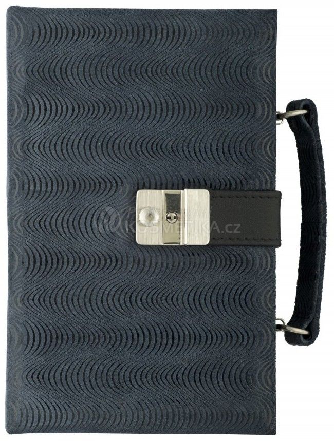 Rodinná luxusní manikúra dárkového typu, vyrobena z černé a tm. modré kůže se vzorem, s dřevěným rámem uzavíraná malým zámečkem na klíček. Rozměr:20,5 x 13 x 6cm