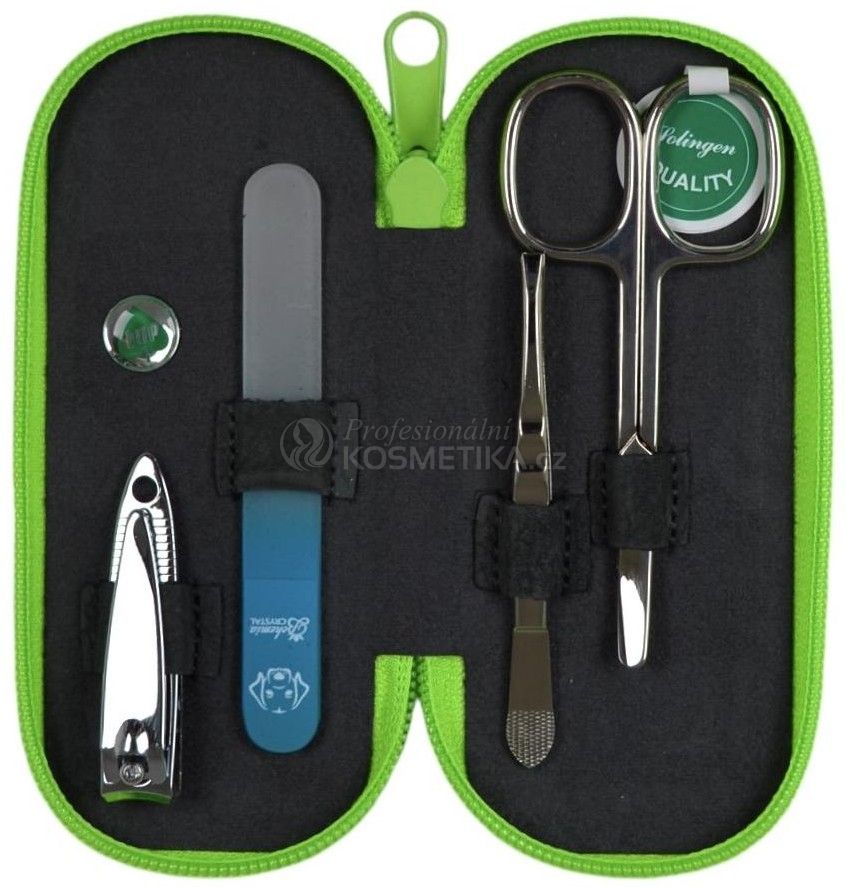 Dětský manikúrní set se základním vybavením s bezbečnými prvky. Pouzdro je vyrobeno z nylonu s motivem míčů a koženýmí poutky uvnitř.
