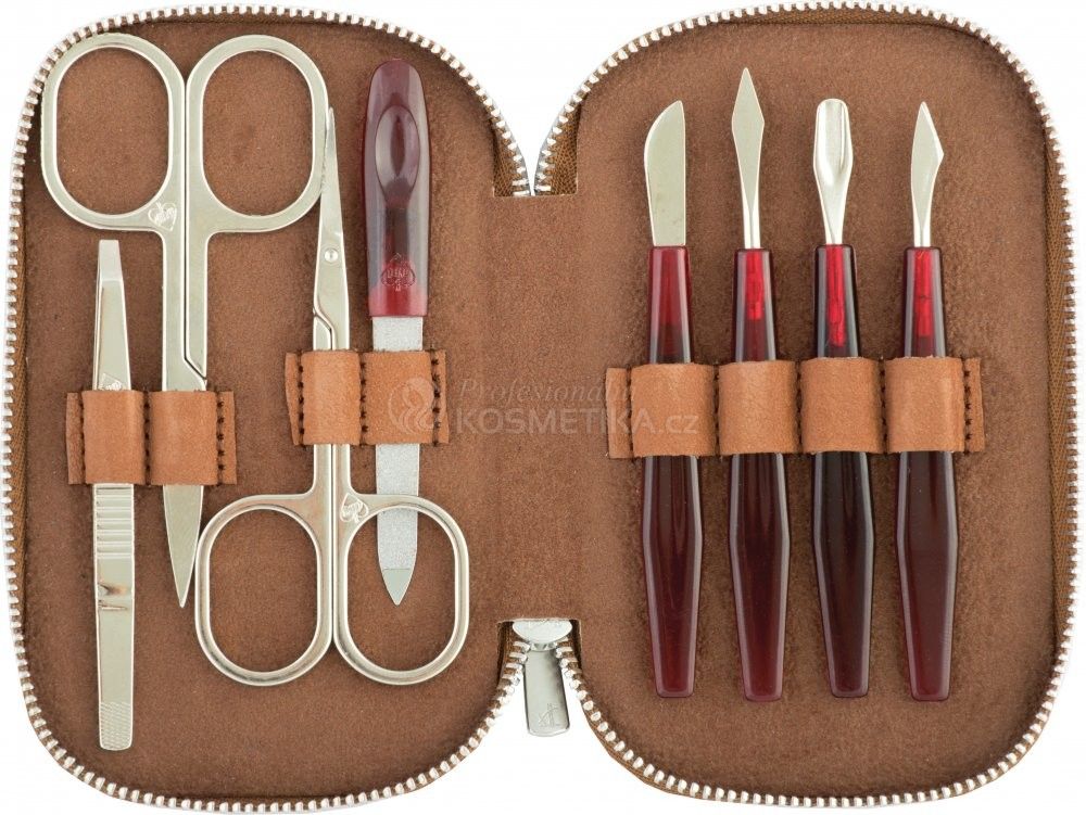 Středně velká manikúrní sada 8-dílná se uzavírá kvalitním zipem YKK, pouzdro je vyrobeno z sv.hnědé kůže se semišovým vzhledem a je naplněno manikúrními nástroji DUP. Rozměry: 12,5 x 8,5 x 2 cm.