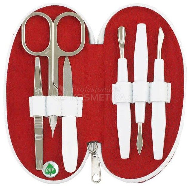 Manikúrní set 6-dílný z červeného nylonu s tečkami, koženými poutky, se uzavírá na zip, hodí se do kabelky každé ženy. Je naplněn manikúrním náčiním značky DUP. Manikúrní sada obsahuje: Nůžky univerzální ohnuté DUP 9 cm Pinzeta rovná čelist DUP Pilník na nehty DUP 8,5 cm 3 manikúrní náčiní DUP (lopatička, nožík,odhrnovač)