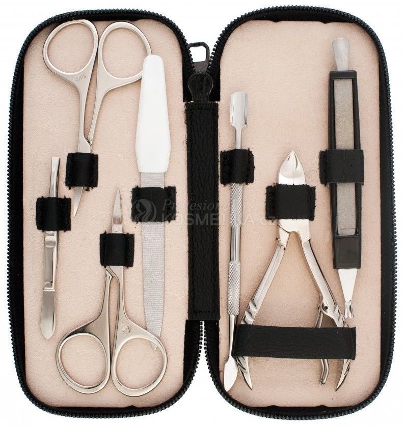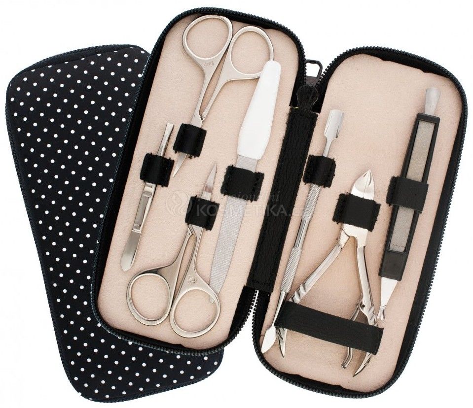 - Luxusní manikúrní sada 7-dílná vyrobená z textilní látky s módními puntíky obsahuje manikúrní náčiní značky DUP, je vhodná pro celou rodinu.