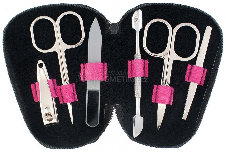 • Manikúrní sada 6-dílná je vyrobena z kůže v růžové barvě, uzavírá se na zip a je naplněna manikúrními nástroji značky DUP.