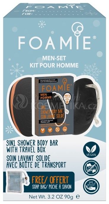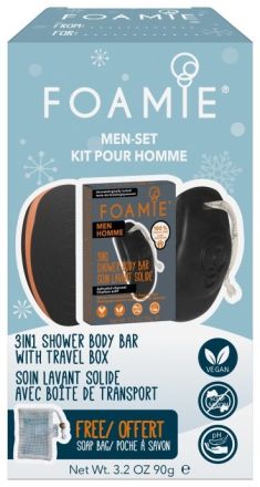 Vánoční limitovaný Starter set Body Men. Obsah: Sprchová péče Foamie Men 3v1, Travel Buddy box.