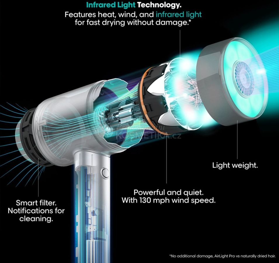 Tradiční vysoušeče vlasů používají horký vzduch, který může vlasy vysušovat a poškozovat jejich strukturu. AirLight Pro kombinuje infračervené světlo s proudem vzduchu, což zajišťuje hlubší a rovnoměrnější rozložení tepla. Výsledkem je zachování přirozené vlhkosti vlasů a snížení dehydratace způsobené sušením.