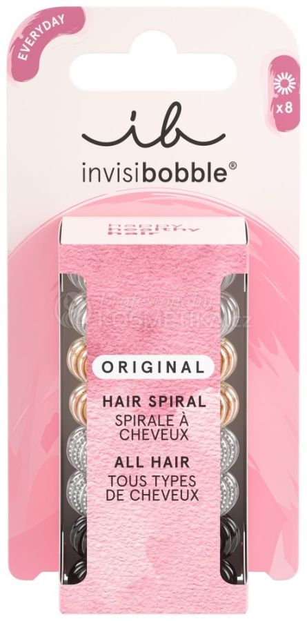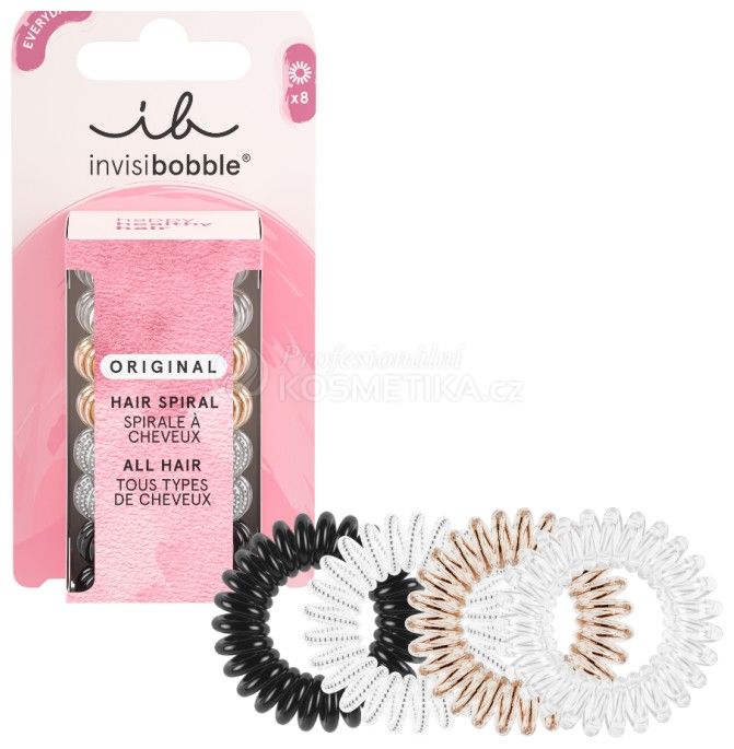 Vlasové gumičky Invisibobble® Original jsou díky svému spirálovitému tvaru ohleduplné k vlasům, netahají, nelámou, nevytváří na vlasech otlak, ani v nich nezanechávají stopy. Jsou hygienické, voděodolné a díky svému hladkému povrchu se nezamotají do suchých ani do mokrých vlasů. Balení obsahuje 8ks gumiček v několika barevných variantách.