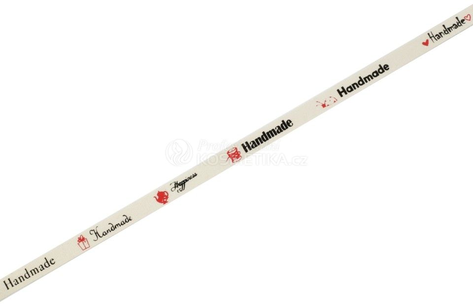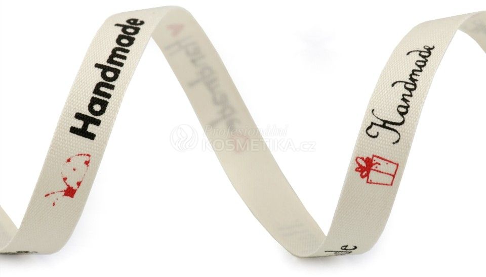 Bavlněnou stuhu zdobí nápis "hand made" v různých stylech písma. Nápisy jsou doplněny jednoduchými obrázky. Stuha je pevná a příjemná na dotek.