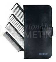 Sada 4 profesionálních kadeřnických hřebenů Bio Ionic uložených v koženém pouzdře. Hřebeny obsahují NanoIonic Mineral, který hydratuje vlasy. Hřebeny jsou vyrobené z karbonu a jsou odlolné vůči vysoký teplotám a poškození.