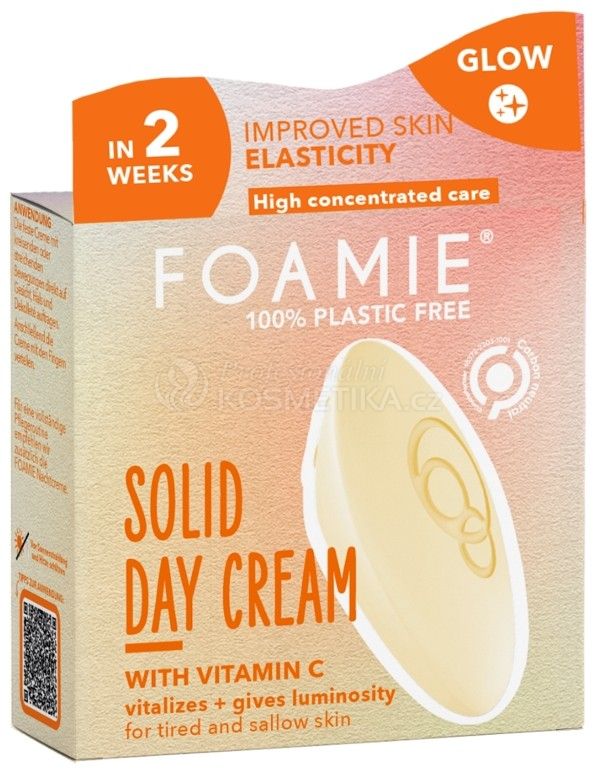 Tuhý rozjasňující krém s vitaminem C snižuje známky únavy a dodává pleti výraznější zářivost. Krém je obohacen o výtažek z kořene kurkumy a jeho celkové složení přispívá k zlepšení zářivosti a pružnosti pokožky. Vyživující složky pobledlou pleť osvěžují, revitalizují a dodávají jí jas. Tuhé pleťové krémy Foamie jsou účinnou alternativou ke krémům v plastovém balení. Kompaktní krémy v ergonomickém tvaru pro rychlé a pohodlné používání se po nanesení změní v krémovou strukturu a dokonale se vstřebou do pokožky. Díky svému praktickému úspornému balení jsou ideální i na cesty. Balení vydrží přibližně dva měsíce. Používají se stejně jako klasický pleťový krém – na očištěný obličej naneste krouživými pohyby krém přímo na pleť a rozetřete ho prsty, aby se zapracoval do pokožky. Případně pro snadnější péči vmasírujte navlhčenými konečky prstů.