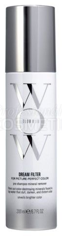 Color Wow Dream Filter Spray odstraňuje z vlasů usazené minerály a kovy obsažené ve vodě, které mohou zkreslit barvu vlasů. Změna a zkreslení barvy vlasů nastává zejména u světlých vlasů. Usazené látky na vlasech způsobují křehkost a lámavost vlasů. Za pouhých několik minut Dream Filter zajišťuje zářivou a svěží barvu vlasů. Extrémně jemný sprej vlasy nevysušuje, nepoškozuje strukturu vlasů a ani nenarušuje či neodstraňuje barvu - a to ani u silně zesvětlených vlasů.