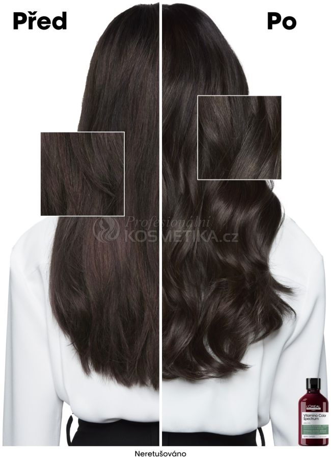 Zachovává tón barvy.* Až o 62 % hebcí vlasy.** Vlasy jsou okamžite až o 66 % více vyživené.** Až o 74 % odolnejší vlasy** *Instrumentální test 4 týdny po aplikaci Vitamino Color Spectrum Zeleného šamponu. **Instrumentální test po aplikaci Vitamino Color Spectrum Zeleného šamponu.