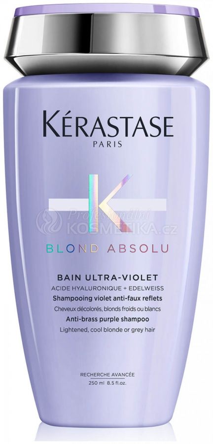 Šamponová lázeň Blond Absolu Bain Ultra-Violet je speciálně vyvinutá pro potřeby zesvětlených, blond nebo šedivých vlasů. Díky bohatému obsahu fialového a modrého pigmentu neutralizuje žluté tóny, zachovává studené odlesky a dodává mimořádný lesk. Složení obohacené o kyselinu hyaluronovou a květ plesnivce alpského zjemňuje vlasové vlákno, léčí trhliny uvnitř vlasového vlákna a zaceluje jeho povrch. Šampon je vhodný ke každodennímu použití.