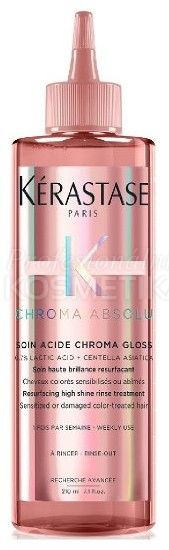 Dopřejte svým vlasům péči, která zajistí jejich obnovu a dodá jim vysoký lesk. Regenerační oplachová kúra Kérastase Soin Acide Chroma Gloss se při kontaktu s vodou promění na bílý krém. Účinné složení proniká hluboko do vlasů bez zatížení a zanechává je hydratované a posílené. Díky obsahu kyseliny mléčné uzavírá vlasovou kutikulu, eliminuje krepatění vlasů způsobené barvením a navíc jim propůjčí hebkost.