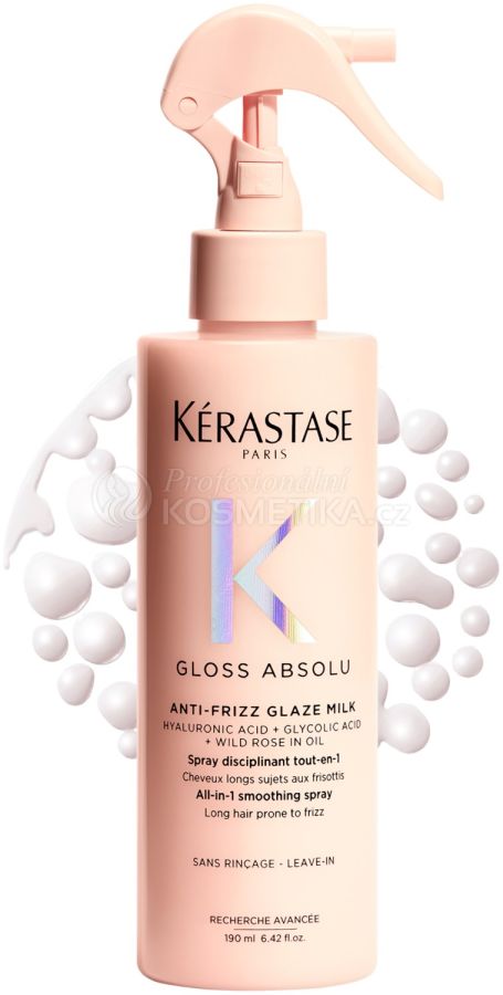Multifunkční uhlazující termoochranný sprej Kérastase Gloss Absolu Anti-Frizz Glaze Milk okamžitě usnadňuje rozčesávání, uhlazuje vlasy, zabraňuje krepatění a vyhlazuje poletující prameny.