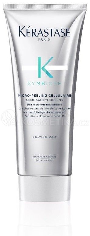 Buněčný mikropeeling Symbiose značky Kérastase nabízí buněčnou mikroexfoliační péči bez silikonů. Jeho čisticí mikropeelingový účinek je založen na kyselině salicylové a rostlinných částečkách, které okamžitě odstraňují odumřelé kožní buňky a šupinky kůže nejen na biologické úrovni, ale i viditelně. Čistí pokožku hlavy, aniž by ji vysušoval, a zmírňuje nepříjemné pocity. Kořínky vlasů jsou po použití zvednuté a vlasy oživené.*