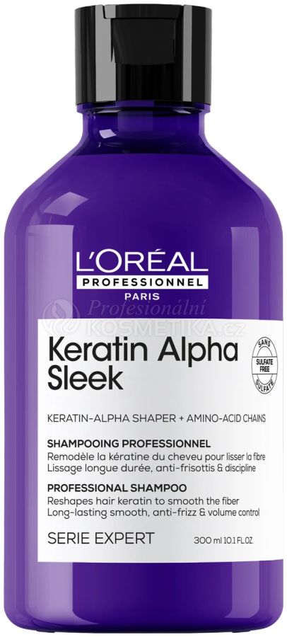Profesionální šampon Keratin Alpha Sleek od L’Oréal Professionnel s obsahem Keratin Sleeker a aminokyselinových řetězců. Profesionální šampon má luxusní ultrakrémovou texturu. Šetrně myje vlasové vlákno, pomáhá uhlazovat vlasy a posilovat vlasový keratin. Tento produkt neobsahuje keratin. Pomáhá přetvářet keratin ve vlasech a uhlazovat vlasové vlákno. Aktivujte uhlazený vzhled vlasů bez krepatění až na 2 týdny.* Až 2× rychlejší denní styling vlasů.* *Instrumentální test po 4 aplikacích šamponu, uhlazující kúry a séra Keratin Alpha Sleek. Pomáhá dodávat hebkost a hydrataci vlasům.**, Pomáhá přinášet okamžitý lesk vlasů.**, Pomáhá kontrolovat krepatění a objem.** **Instrumentální testy pouze se šamponem.