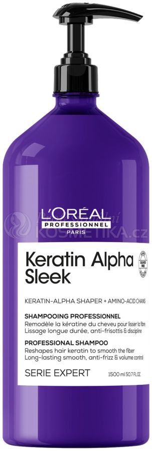 Profesionální šampon Keratin Alpha Sleek od L’Oréal Professionnel s obsahem Keratin Sleeker a aminokyselinových řetězců. Profesionální šampon má luxusní ultrakrémovou texturu. Šetrně myje vlasové vlákno, pomáhá uhlazovat vlasy a posilovat vlasový keratin. Tento produkt neobsahuje keratin. Pomáhá přetvářet keratin ve vlasech a uhlazovat vlasové vlákno. Aktivujte uhlazený vzhled vlasů bez krepatění až na 2 týdny.* Až 2× rychlejší denní styling vlasů.* *Instrumentální test po 4 aplikacích šamponu, uhlazující kúry a séra Keratin Alpha Sleek. Pomáhá dodávat hebkost a hydrataci vlasům.**, Pomáhá přinášet okamžitý lesk vlasů.**, Pomáhá kontrolovat krepatění a objem.** **Instrumentální testy pouze se šamponem.