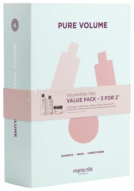 Řada Maria Nila Pure Volume je hydratační a je určena zejména pro jemné vlasy.  Vitamin B5 dodává vlasům objem a vitalitu a zároveň poskytuje optimální péči. Komplex Colour Guard chrání vlasy před UV zářením a zajišťuje déle trvající zářivou barvu.
