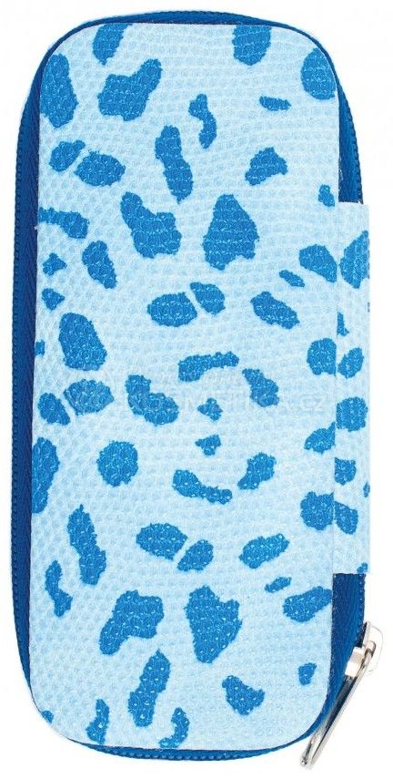 - Pouzdro je ušito z modré koženky s flíčky.