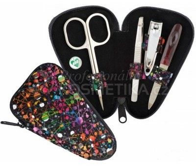 Malý 4-dílný manikúrní set vhodný do kabelky, kanceláře i školy. Obsahuje nejnutnější manikúrní nástroje značky DUP a je vyrobená z příjemné kůže s barevným potiskem. Uzavírá se na zip. Manikúrní sada obsahuje: Nůžky na záděrky ohnuté 9 cm Pinzeta šikmá čelist Pilníček na nehty 9 cm Štipka malá 5,5 cm Rozměry: 10,5 x 6,5 x 2 cm.