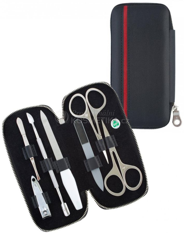 Elegantní manikúra, která je vyrobená z černé kůže s červeným módním proužkem. Uzavírá se na zip. Vybavení manikúry je značky DUP.