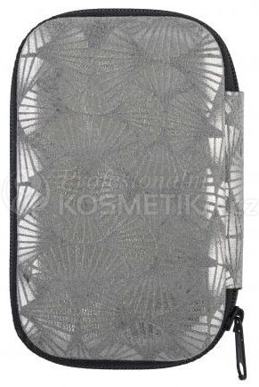 Středně velká manikúrní sada 8-dílná se uzavírá na zip, pouzdro je vyrobeno z šedé koženky se stříbrným vzorkem, poutka jsou z kůže, manikura je naplněna manikúrními nástroji DUP. Rozměry: 12,5 x 8,5 x 2 cm.