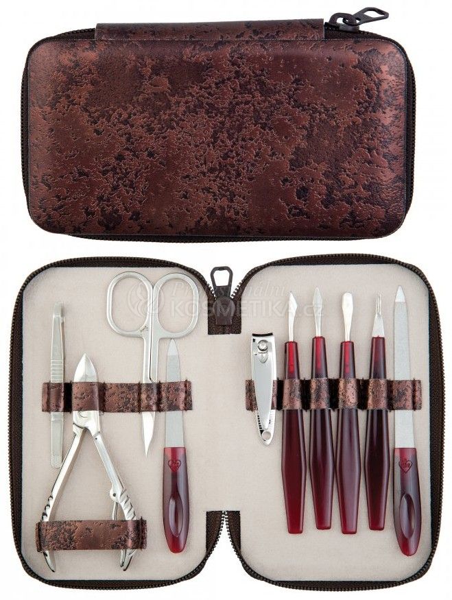 - Koženková manikúrní sada 10-ti dílná v měděné barvě obsahuje manikúrní náčiní značky DUP, které potěší každou ženu.