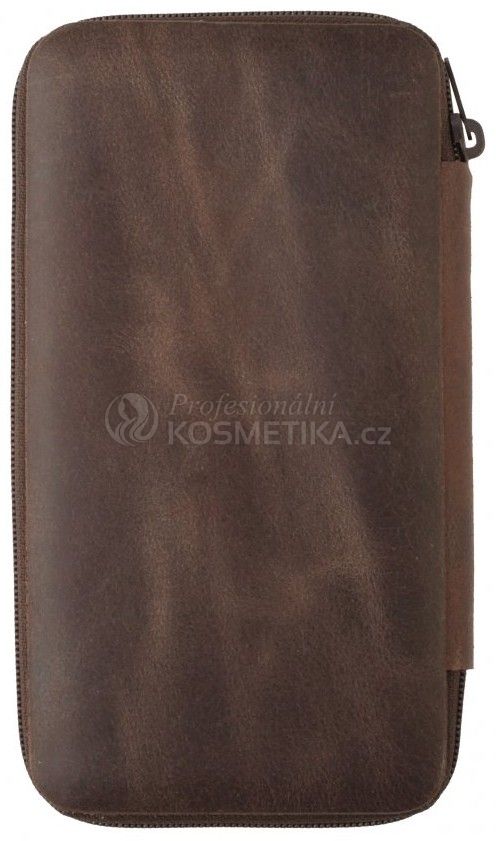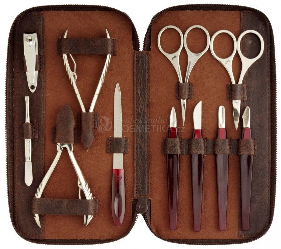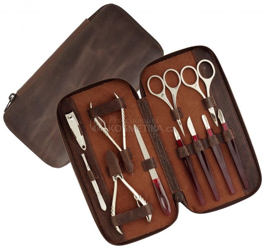 - Velká rodinná 11-dílná manikúrní sada je vyrobena z hnědé kůže, obsahuje náčiní značky DUP a uzavírá se zipem.